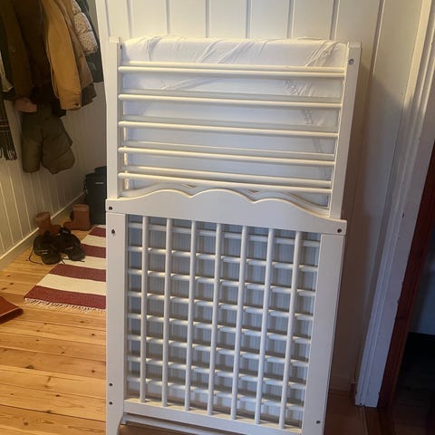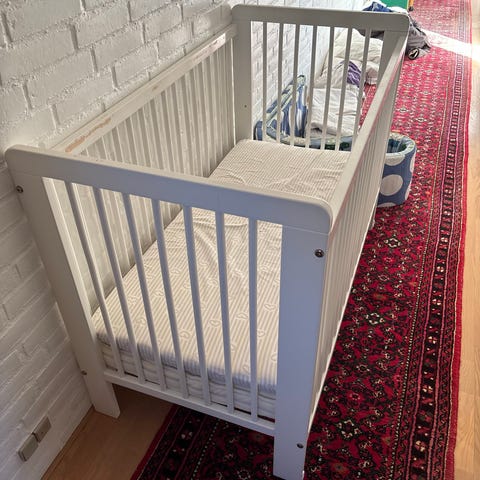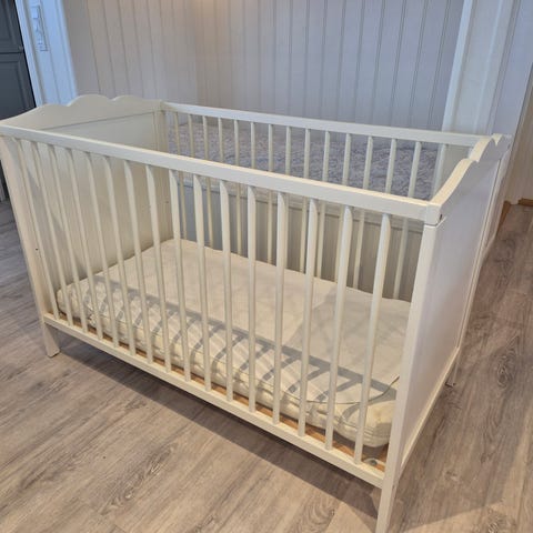 Børnetremmeseng i hvid. Klassisk tremmeseng med tremmer på langsiderne og faste gavle. Bund med ventilationshuller. Velegnet til spædbørn og småbørn som sovemøbel på børneværelset. Kan afhentes gratis i Søborg. Madras følger med for 100 kr.