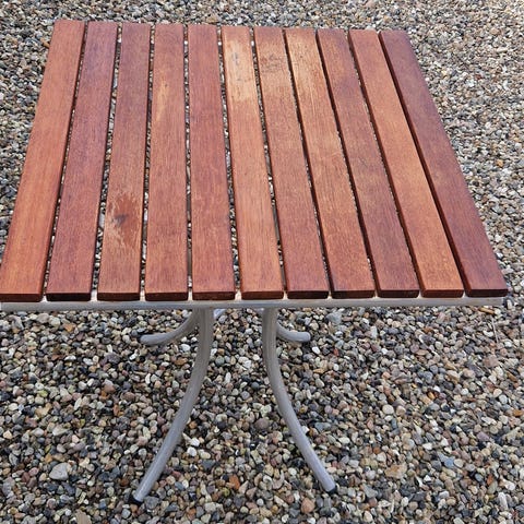 Ovalt teaktræs havebord. Bordet har plade af trælameller og står på fire ben med tværstiver. Velegnet til brug på terrasse eller i have. Træet fremstår patineret efter udendørs brug. Sælges uden tilbehør på billederne men med tillægsplade der er fastgjort under bordpladen og kan slås yderligere ud.