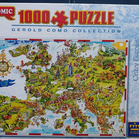 Puslespil med 1000 brikker. Motivet er: Cartoon map America. Er lagt en gang. Der mangler ingen brikker. Fra et ikke ryger hjem. Prisen er 50 kr. Kan sendes mod betaling af fragt.