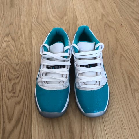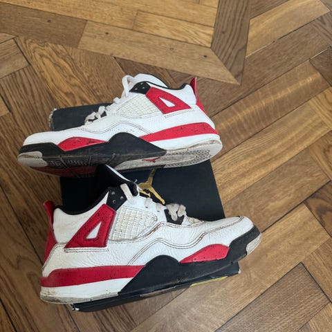 Jordan sneakers i størrelse 44. Modellen er en høj sneaker med snørelukning. Skoene er primært hvide med sorte og røde detaljer samt lys sål. Overdelen er i syntetisk materiale med perforeringer i siderne og polstret skaft. Velegnet som hverdagssko eller til fritidsbrug.