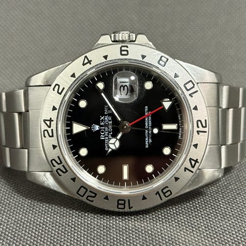 Klassisk Explorer II med sort skive, udført i 40 mm rustfrit stål og med safirglas. Ref. 16570 repræsenterer den mere slanke og funktionelle generation af Explorer II med fast stålkrans og tydelig 24-timers skala. Skiven har datovisning ved klokken 3 samt den karakteristiske røde GMT-viser til aflæsning af en anden tidszone.