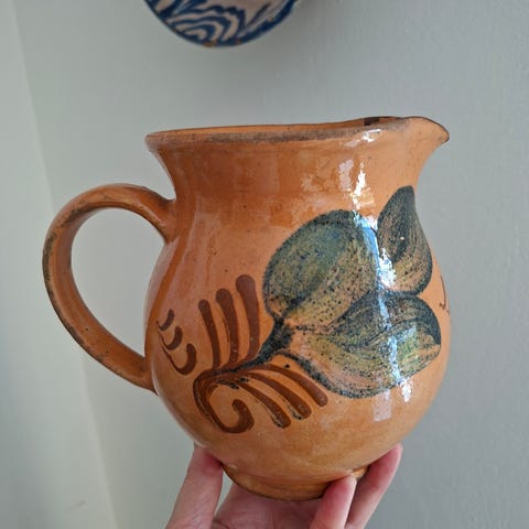 En gammel keramik kande som kan bruges til saft eller som vase.