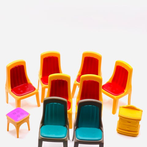 Plastik bord og stole sæt til dukkehus i lille skala. Sættet består af et rundt hvidt bord med mønster i bordpladen og tre røde stole med udskæringer i ryglænet. Egnet som møbler til dukkehus eller anden miniatureleg, fremstillet i hård plast. Border er 4 cm højt og 5 cm i diameter. Stolene er 5 cm høje