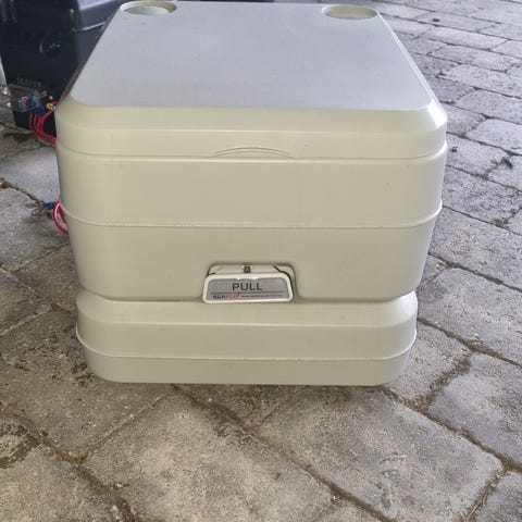 Brugt 6 uger under badeværelse renovering.Hamron transportabelt kemisk toilet med øvre skylletank på 12 liter og nedre affaldstank på 22 liter. Toilettet er kemisk og egner sig til brug i campingvogn, båd, kolonihavehus eller andre steder uden fast toiletinstallation. Enheden består af to sammenkoblede tanke, hvor den øverste del rummer skyllevand og toiletsæde med låg, og den nederste del fungerer som opsamlingstank med bærehåndtag og aftapningsrør. Farven er grå, og materialet er plast, som er let at rengøre. Toilettet er konstrueret som et fritstående, bærbart campingtoilet, der kan placeres efter behov og flyttes ved hjælp af de integrerede håndtag.