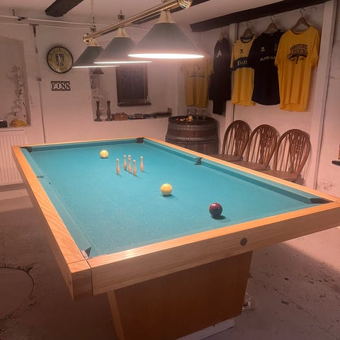 Billardbord med grøn dug og sorte ben. Bordet står på en terrasse og er egnet til indendørs eller overdækket udendørs brug efter behov. På bordet ses billardkugler og køer, hvilket indikerer, at grundlæggende tilbehør til spillet medfølger. Velegnet til fritidsbrug i hjemmet, f.eks. i opholdsrum, kælder eller på overdækket altan/terrasse. Størrelsen fremgår ikke præcist af billedet, men bordet er mindre end et standard turneringsbord og passer typisk til privat brug.