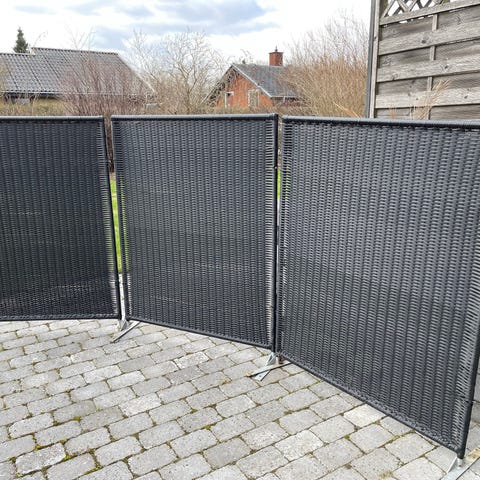 Skærmvæg i flettet materiale i sort farve. Består af tre sammenhængende paneler, der kan foldes efter behov. Egnet til afskærmning på terrasse, altan eller i have, eller til opdeling af rum. Højde 120 cm - bredde 3 x 80 cm