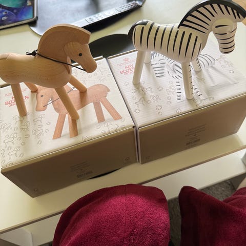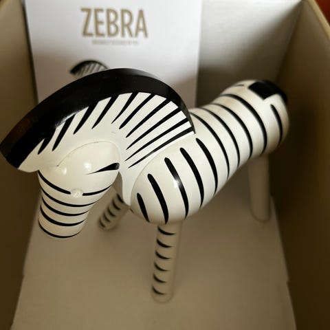 Kay Bojesen Zebra træfigur i hvid med sorte striber. Klassisk designet dyrefigur udført i malet træ. Egnet som dekoration i stue, børneværelse eller på reol. Leveres med original æske og stofpose, hvis dette fremgår af billederne.