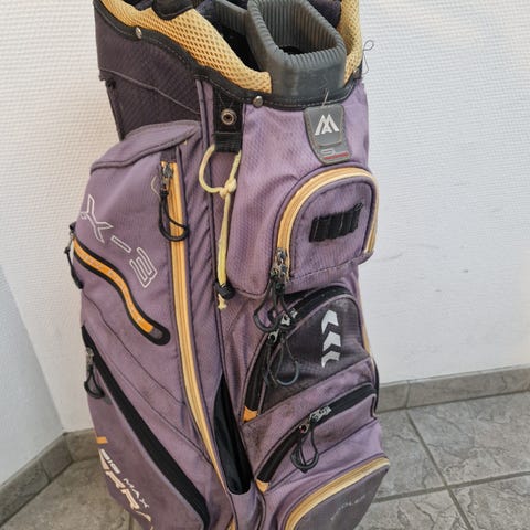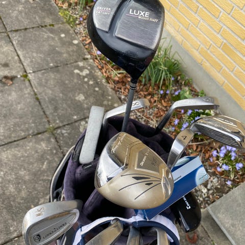 Maxfli Maxxum golfkøllesæt med bag og vogn i rød. Sættet omfatter flere køller, herunder drivere, fairwaykøller og jern, som ses på billederne. Køllerne har metalhoveder med rød og sølvfarvet finish. Golfbagen er en stående bag med flere lommer til opbevaring af bolde, tees og tilbehør, samt bæreremme. Der medfølger en matchende rød bagnav og en simpel golfvogn med to hjul, der gør det muligt at trække bagen rundt på banen. Velegnet som komplet sæt til golfspillere, der ønsker køller, bag og vogn samlet. Desuden diverse tilbehør bolde og tees