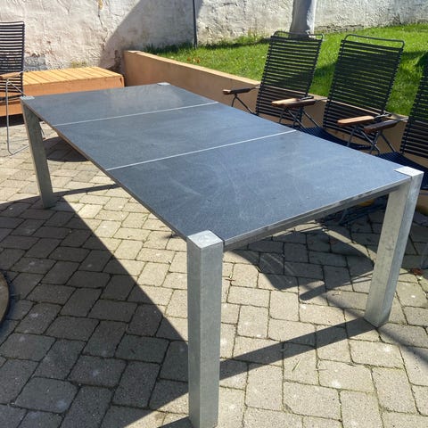 Oliebehandlet bambus, praktisk granitplade i midten, stel i stålgrå metal. 6 personer. Velholdt, men let sort misfarvning (se fotos). Nyolieret.