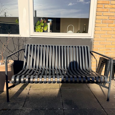 3 stole i sprøjtemalet stål som kan modstå vind og vejr og er designet til at stå ude året rundt
