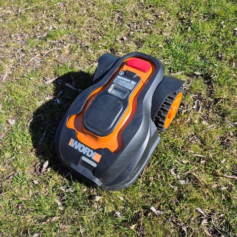 Robotplæneklipper i orange farve. Egnet til automatisk klipning af græsplæner i haven. Enheden kører selvstændigt på plænen og kan klippe tæt på kanter og buske. Velegnet til dig, der ønsker automatisk vedligeholdelse af græsarealer omkring hus eller have..