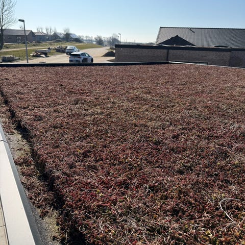 Sælger hele dette område med sundt og tæt Sedum-bunddække (krybende Sankthansurt). Det er den perfekte plante til dig, der vil have et grønt tæppe, som passer sig selv og holder ukrudtet væk. Det er utroligt hårdført og breder sig hurtigt.