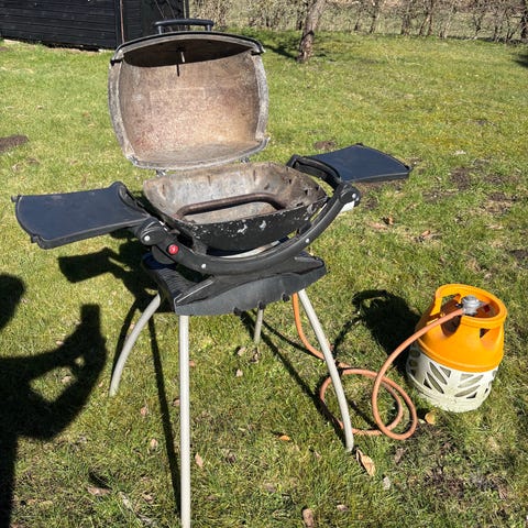 Weber Q gasgrill med stativ og hjul. Grillen har låg og bund i støbt materiale samt grillrist i støbejern. Modellen er udstyret med sideborde, der kan klappes op og ned, samt håndtag og betjeningsknap på siden. Der medfølger overtræk med Weber Q-logo, som dækker grill og stativ. Grillen tilsluttes gasflaske via slange og regulator, som ses på billederne. Velegnet til udendørs madlavning på terrasse eller altan, hvor der ønskes en kompakt gasgrill med stativ og opbevaringsmuligheder under grillen.