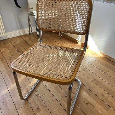 2 frisvinger stole i lys stramt og intakt flet med original stempel i bunden "Made in Italy". Står i fin stand uden rust.