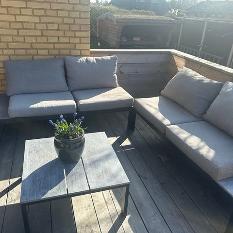 Havemøbelsæt loungesæt med sofa, to loungestole og rektangulært bord. Sættet har sort metalstel og grå hynder i stof.