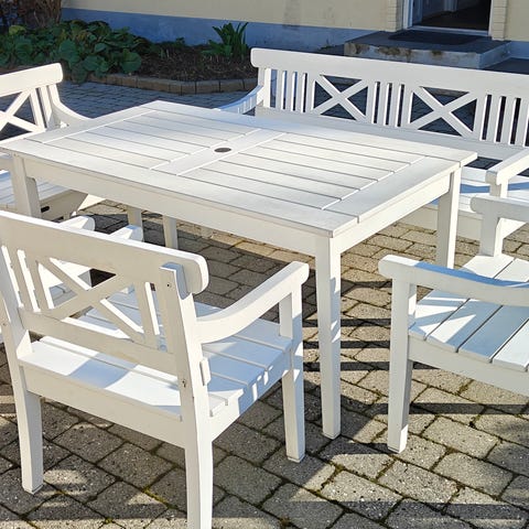 Hvid klassisk Drachmann havebænk i træ med klassisk 120cm bred