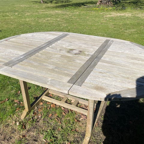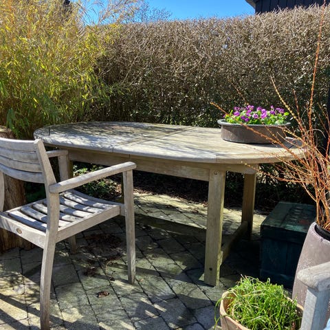 Kvadratisk havebord i teaktræ med lamelbordplade. Bordet har krydsben og er egnet til udendørs brug på terrasse, altan eller i have. Simpelt og funktionelt design i naturtræ.