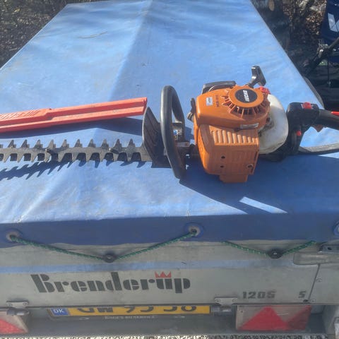 Jeg har en buskeryder som jeg har fået i bytte med noget andet, den er opstartet og hæk klipper og kæde sav er testet osse og virker, men den mangler hovede og klinge til at klippe kanter