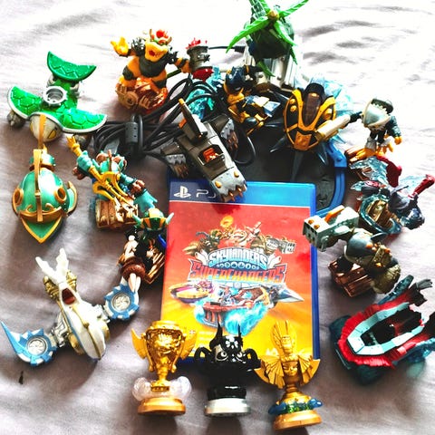 SKYLANDERS SUPERCHARGERS FIGURER OG KØRETØJER til Playstation 4. Sættet består af flere forskellige Skylanders-figurer samt tilhørende køretøjer i blandede farver og designs.