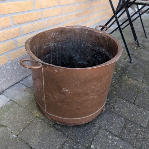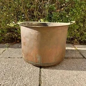 Kobber gryde/spand med hank. Rund beholder i kobber med hank i sort metal. Velegnet som dekorationsgenstand, plantekrukke, brændekurv eller opbevaringsspand i hjem eller have. Den fremstår med brugsspor og patina, som giver et rustikt udtryk.