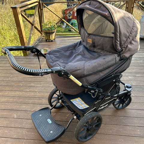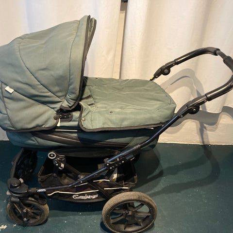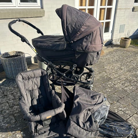Flot og velholdt Sort kombivogn. Brugt af ét barn. Den har praktiske drejehjul foran, som kan låses så de kun kører ligeud (fx til en tur i skoven med småsten), alle dæk er punkterfrie og den har også en varekurv. Den har også rygstøtte i bunden, så barnet kan sidde op. Stellet er sort og der er ingen rust eller ridser. Det er let at slå sammen og alle fire hjul klikkes også let af. Styret kan justeres i højden og bremsen trykkes også let ned. Den har termobund til sommer og vinter og der er ligeledes udluftning i kalechen.