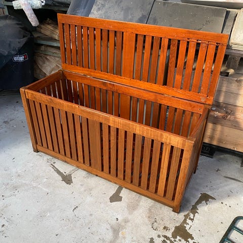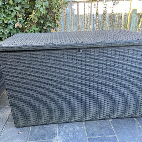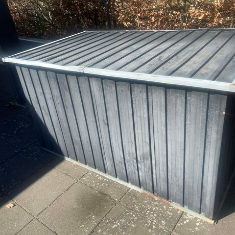 Udendørs opbevaringsbænk i brunt træ. Bænken har lamel-design i sider og låg, som giver ventilation til indholdet. Velegnet til opbevaring af f.eks. hynder, haveredskaber eller andre ting på altan, terrasse eller i have. Solid træ-konstruktion med rektangulær form og fladt låg, der også kan bruges som siddeplads. Længde 122 cm, højde 55cm, dybde 57 cm