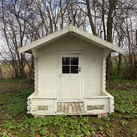 Træ legehus i klassisk rød farve med hvide detaljer. Huset har lille overdækket veranda foran indgangen, dør med vindue og sidevindue, som giver lys ind i huset. Taget er saddeltag med tagpap, og der er lidt mos på taget, som jeg synes giver det et hyggeligt udtryk. Det virker til at være et samlesæt som let skilles ad og samles igen.