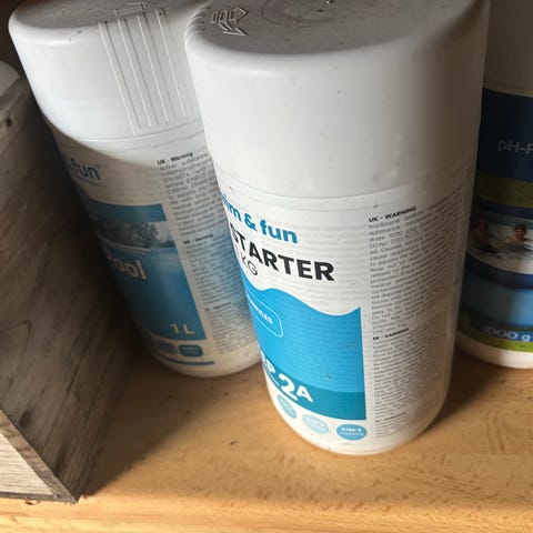 Pool tilbehør sæt med sandfilterpumpe, støvsugerhoved, slanger, skimmerkurv, testsæt og forskellige poolkemikalier. Sættet omfatter en blå sandfilterpumpe med tilhørende slanger til cirkulation og filtrering af poolvand, et manuelt støvsugerhoved til bundrengøring samt flydeskum-nudler. Der medfølger flere beholdere med poolkemikalier til vandbehandling, herunder klor- og plejemidler, samt teststrips eller testkit til kontrol af vandkvalitet. Sættet er egnet til brug ved udendørs swimmingpools til både rengøring, filtrering og løbende vedligeholdelse af vandet.