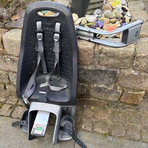 Yepp børne cykelstol. Maksimal belastning omkring 22 kg. Cykelstolen er i sort plast med ventilationshuller i ryg og sæde, integreret 3-punktssele og fodstøtter med justerbare remme. Medfølgende beslag til montering på cykelstel.