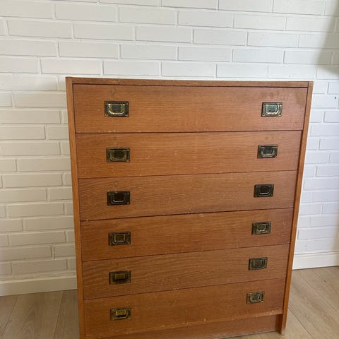 Kommode blå med enkelt skuffe i grå. Står flot og stabilt.