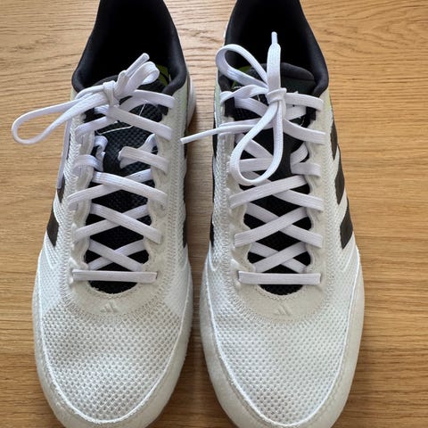 Adidas power lift sko i størrelse 43. Skoene er overvejende blå med røde og hvide detaljer samt rød inderside. Ydersålen har mønster, der giver greb på underlaget. Velegnet til vægtløftning og styrketræning
