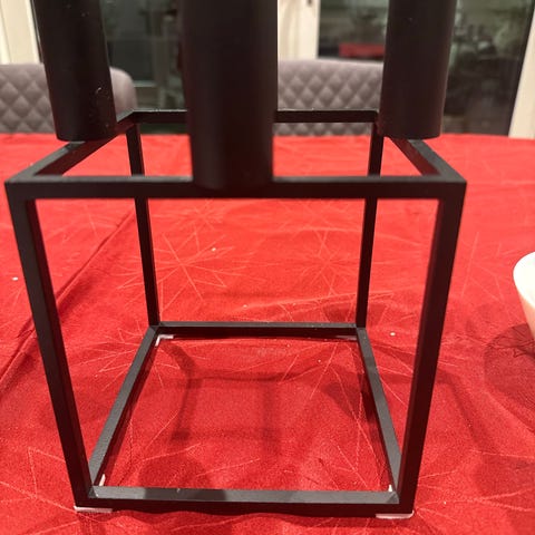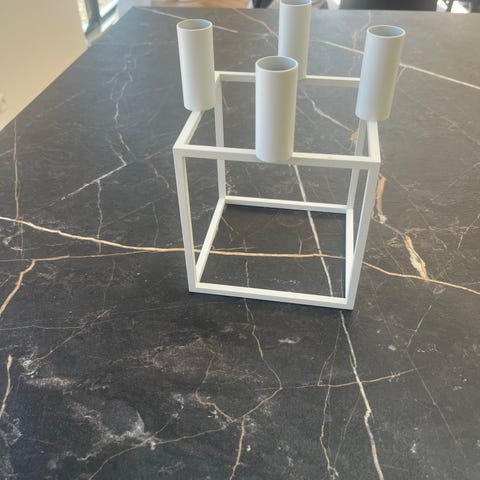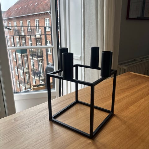 Lysestage i kubisk design i sort metal. Stagen har en firkantet base og en cylinderformet holder til et almindeligt stearinlys. Velegnet som borddekoration eller til vindueskarm. Enkel, geometrisk form der passer ind i mange typer indretning.