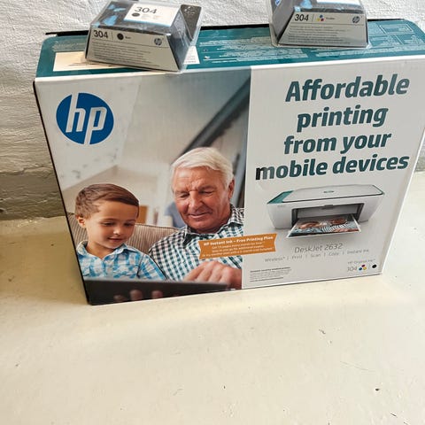 HP DeskJet 2723e printer i hvid/rød. Multifunktionsblækprinter med integreret scanner under topdækslet. Kontrolpanel i siden med display og funktionsknapper til blandt andet trådløs forbindelse, kopi og information. Egnet til almindelig print og scanning i hjemmet eller på et lille kontor.