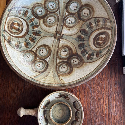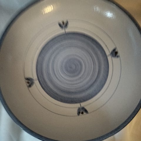 Rundt keramik fad med håndmalet blomstermotiv i blå og grønne nuancer på lys glasur. Tallerkenen har let forhøjet kant og rustik udtryk med synlig lerfarve langs kanten.