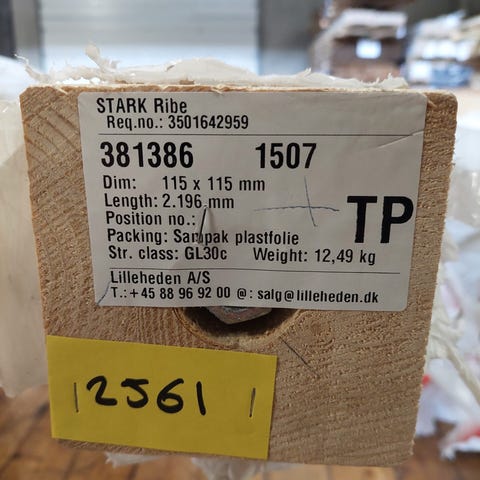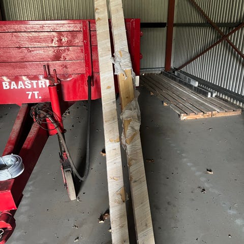 Limtræsstolpe 4244 mm ø200 mm. 7 lags stolpe fra Lilleheden A/S. Stolpen er lettere beskidt. Den har en stolpe fod i den ene ende som måler 498 mm. I den anden ender er der en udfræsning som måler 115 mm og er fræst 60 mm ind i stolpen. Mål:L4244xØ200mm.