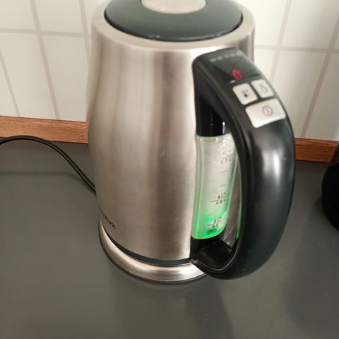 Alessi elkedel i rustfrit stål med cremefarvet håndtag og fod. Elkedlen har et kegleformet design med hældetud og aftageligt låg. Den står på en elektrisk base med ledning og stik til almindelig stikkontakt. Velegnet til opvarmning af vand i køkkenet. Designet gør den egnet til placering på køkkenbordet, når den ikke er i brug.