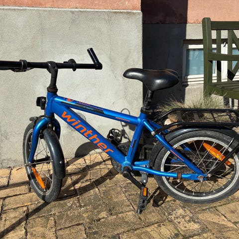 Winther børnecykel med 16" hjul i pink. Cyklen har lav indstigning og lige styr med håndbremser. Udstyret med forkurv, bagagebærer og reflekser. Har lidt rust her og der men ellers fin cykle. Er købt for 2 1/2 år siden til 3500 kr.