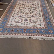 Stort tæppe med orientalsk inspireret mønster i flere farver på lys bund. Rektangulær form med bort hele vejen rundt og korte frynser i enderne. Egnet som gulvtæppe i fx orangeri.