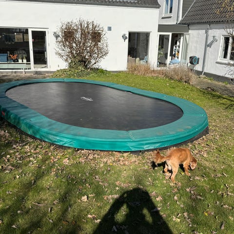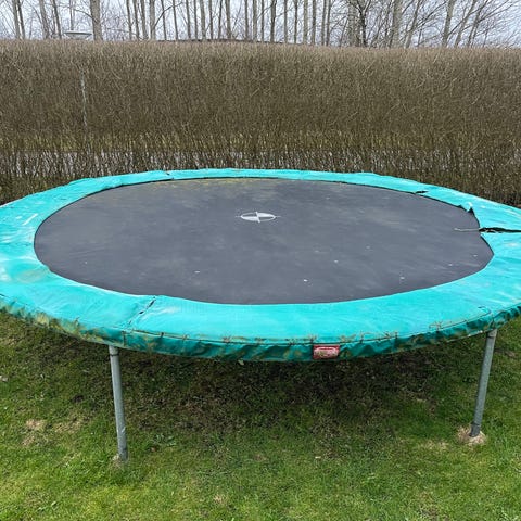 BERG InGround Favorit trampolin i rund model med grøn kantpude. Trampolinen er beregnet til nedgravning i haven. Modellen har metalramme med fjedre og sort springdug. Kantpuden er grøn og dækker fjedrene, men der ses tydelig slitage og huller i polstringen på billederne. Velegnet som nedgravet udendørs trampolin til leg og motion, eventuelt med behov for udskiftning eller reparation af kantpuden efter købers vurdering.