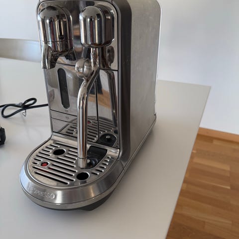 Nespresso espressomaskine i stål. Maskinen er kapselbaseret og har front med drypbakke og aftagelig rist. Udstyret med to separate udløb og betjeningsknapper på fronten. Velegnet til brygning af espresso og andre kaffedrikke med Nespresso-kapsler i hjemmet eller på kontoret.