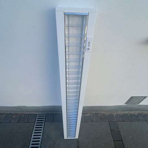 LED loftarmatur i hvid med integrerede LED‐moduler og gitteroptik. Armaturet er aflangt og egner sig til montering i loft, f.eks. i kontor, værksted eller garage. Huset er i hvidt materiale med reflektor/gitter i metal for styret lysfordeling. Tilslutning sker via indbygget driver, som fremgår af mærkaten på armaturet. Velegnet som generel rumbelysning, hvor der ønskes et smalt, rektangulært loftarmatur med LED.