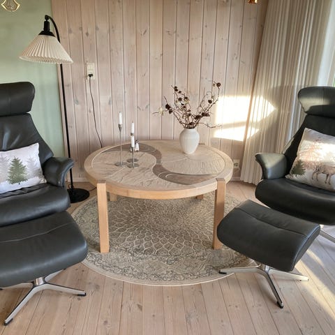To læder lænestole så gode som nye med skamler. De er ikke brugt ret meget og er indstillige i ryggen.