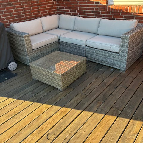 Betræk er hjemmelavet, men fungerer godt. Kan vaskes.