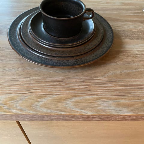 Stel bestående af spisetallerkener 28 cm og en kaffekop med underkop og tallerken i stentøj (16 stk). Sættet er i en beige nuance med mørkere kantdetaljer. Egnet til servering af varme og kolde retter samt varme drikke. Kan anvendes i dagligdagen eller som ekstra stel til gæster.