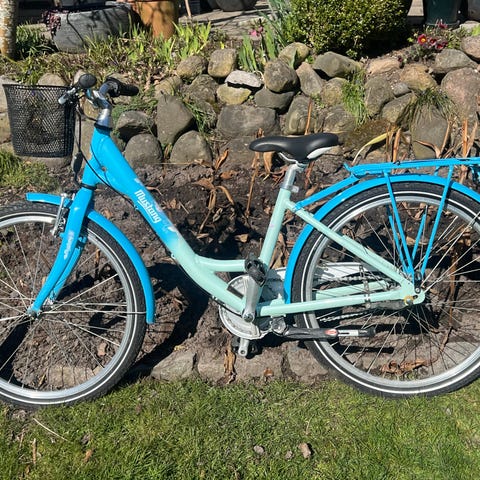 Mustang børnecykel med 24" hjul i lyseblå farve. Cyklen har lav indstigning, bagagebærer, skærme og støtteben. Foran er der monteret cykelkurv. Sæde og håndtag er i brun farve. Velegnet som hverdagscykel til børn i skolealderen.