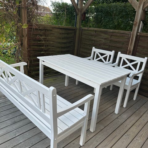 Sættet er fuldt funktionsdygtigt og står solidt. Da der er tale om et brugt sæt, fremstår de hvide overflader med naturlig patina, hvilket er medregnet i prisen. Det rustfrie stål er i god stand og bygget til at modstå det danske kystklima.