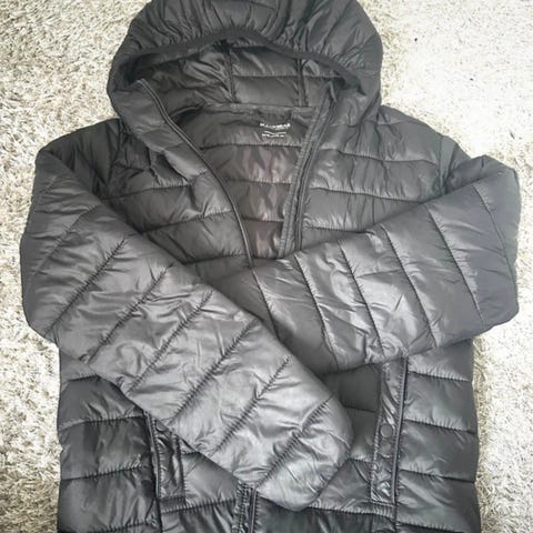 Lys kort taljelang jakke str. L. Jakken har detalje med hætte i kraven samt mulighed for kort ærme (med oprul og beslag, se foto) eller mulighed for langt ærme. Næsten ubrugt. Kan bruges inde som cardigan og ude som tynd jakke. Foer overalt, også i ærmerne. Røg-og dyrefrit hjem. Kun vasket i parfumefrit vaskepulver. Sendes gerne.