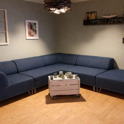 Koksgrå modulsofa fra Formel A. Den er 10 år gammel, men lavet i slidstærk uld. Stadig god skum, kan med lidt pletrens og peeling blive flot igen.