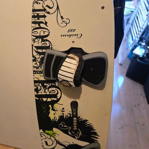 Kerosine Bang kiteboard i grøn og hvid med grafisk print. Boardet har fodstropper og håndtag monteret på oversiden. Velegnet til kitesurfing og freeride-brug. Materiale og præcise mål fremgår ikke af oplysningerne og bør kontrolleres ved interesse.