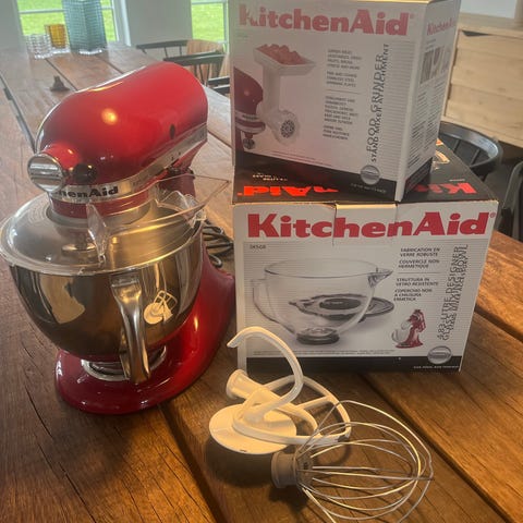 KitchenAid Artisan røremaskine i lilla. Røremaskinen leveres med en skål i glas med hældetud samt en skål i rustfrit stål med hank. Der medfølger piskeris, dejkrog og fladpisker. Velegnet til æltning af dej, piskning og blanding af ingredienser i køkkenet.